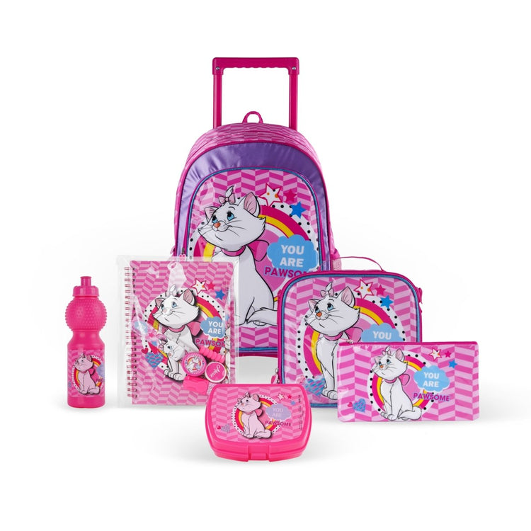 • مجموعة ديزني ماري يو آر باوسم 6 في 1. 18 بوصة - 1 عربة، 1 حقيبة غداء، 1 حافظة أقلام، 1 صندوق غداء، 1 زجاجة مياه، 1 مجموعة زيبلوك.
