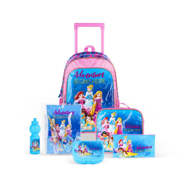 • مجموعة مغامرات أميرات ديزني تبدأ هنا 6 في 1. 16 بوصة - 1 عربة، 1 حقيبة غداء، 1 حافظة أقلام، 1 صندوق غداء، 1 زجاجة مياه، 1 مجموعة زيبلوك.