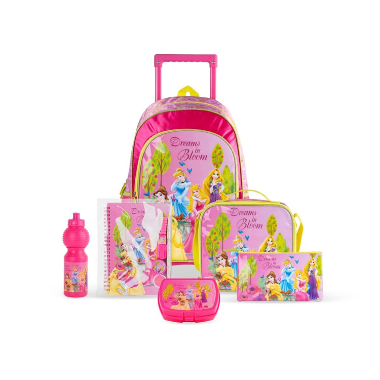 • مجموعة صندوق ديزني برينسس دريمز إن بلوم 6 في 1. 18 بوصة - 1 عربة، 1 حقيبة غداء، 1 حافظة أقلام، 1 صندوق غداء، 1 زجاجة مياه، 1 مجموعة زيبلوك.