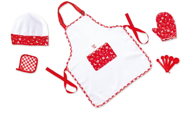 تألقي وأنتِ تُحضّرين أشهى الوجبات مع مجموعة ألعاب الطهاة. تتضمن قبعة، ومئزرًا، وقفاز فرن، وحامل قدر، وخمس ملاعق قياس.