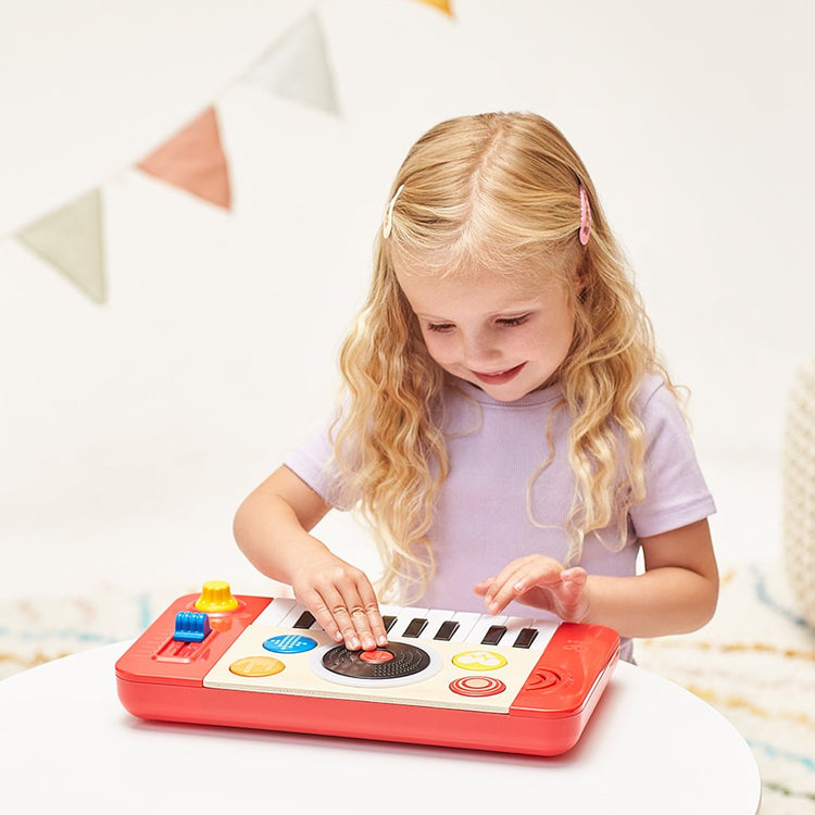 هذه الآلة الموسيقية عبارة عن مزيج من ١٨ مفتاح بيانو وأسطوانة سوداء قابلة للخدش. اختر من بين أربع آلات موسيقية مختلفة، و١٨ مؤثرًا صوتيًا، وأربعة مؤثرات دي جي، وخمسة مسارات خلفية لمزج الموسيقى عليها. مستوى الصوت قابل للتعديل، وسيستمتع أساتذة الموسيقى بميزة تغيير سرعة الإيقاع. سيستمتعون بالعزف التفاعلي، حيث يصبحون منسقي الأغاني في غرفة اللعب، يعزفون على القرص، متتبعين الأضواء التي تومض على الإيقاع.