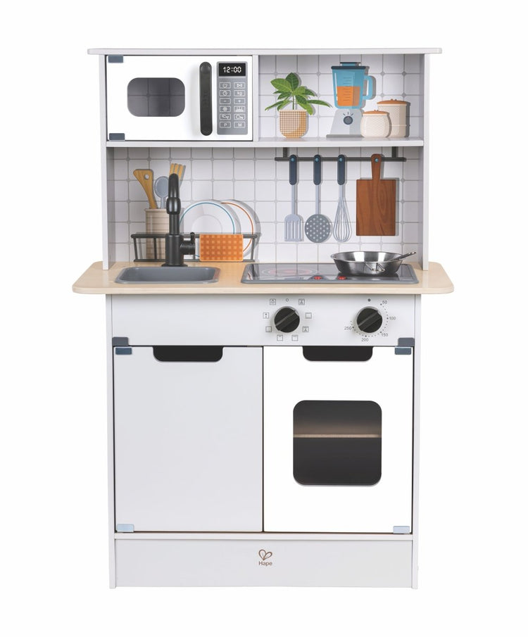 استلهم لطهي أشهى المأكولات مع هذا المطبخ العصري. مزود بموقد إلكتروني مضيء، ومؤثرات صوتية واقعية للطهي، وحنفية دوارة، ورف خشبي عملي لتخزين جميع توابلك. ابدأ الطهي فورًا باستخدام المقلاة والملعقة المرفقة. ولمسة واقعية إضافية، توجد خلفية مرسومة عليها نبتة، وأكواب، وأطباق، وأدوات مطبخ أخرى. الآن، ما عليك سوى إيجاد مقاعد كافية لضيوفك على العشاء! ساعات من المرح: ستوفر مجموعة ألعاب المطبخ الخشبية هذه ساعات ممتعة مع العائلة والأصدقاء، مع تشجيع لعب الأدوار والخيال والإبداع. ميزات واقعية: بالإضافة إلى المؤثرات الضوئية المذهلة، يصدر الزر الأيسر صوت غليان، ويصدر الزر الأيمن صوت طهي يستمر لمدة عشر ثوانٍ. مساحة تخزين واسعة: ستتمكن من حفظ جميع أدوات مطبخك مرتبة ونظيفة في الخزانة بجانب الفرن. مواد صديقة للأطفال: ألعاب هيب متينة وآمنة للأطفال، بطلاء مائي وتشطيبات غير سامة، ومعظم العناصر مصنوعة من الخشب والمنتجات الطبيعية. أبعاد المنتج (الطول × الارتفاع × العرض): 59.8 × 85.5 × 29.7، وزن المنتج (كجم): 8.60