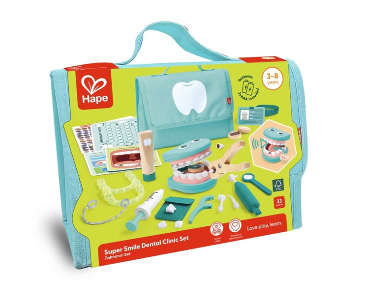 مجموعة عيادة الأسنان سوبر سمايل من هابي هي مجموعة لعب أدوار تعليمية وتفاعلية مصممة للأطفال من سن 3 سنوات فما فوق.