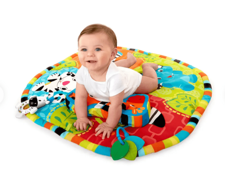 Designed using sensory stimulating principles, the Bright Starts™ Spots & Stripes Safari Gym is packed with activities and features. The giraffe prop pillow supports baby during tummy-time and the large play mat features high-contrast colors, exciting patterns, and fun characters. The toy set includes a tiger toy with 20+ minutes of lights and melodies, zebra rattle, tiger chime, baby-safe mirror, bug link, and leaf-shaped toys. Set Contains: