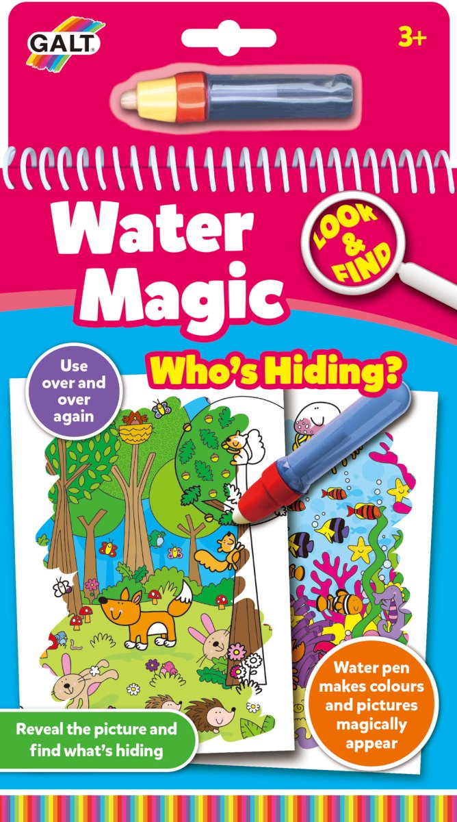 A chunky spiral book with 6 reusable pictures on thick board to colour with the water pen, plus an extra look and find activity. Fill the pen with water and use to reveal the hidden coloured pictures then discover who's hiding in each scene. Find 5 frogs in the pond scene, 6 birds in the woods and so on. The boards are white with black picture outlines. When wet, the coloured picture appears... then disappears when dry. This chunky board book with mess-free colouring is ideal when travelling.