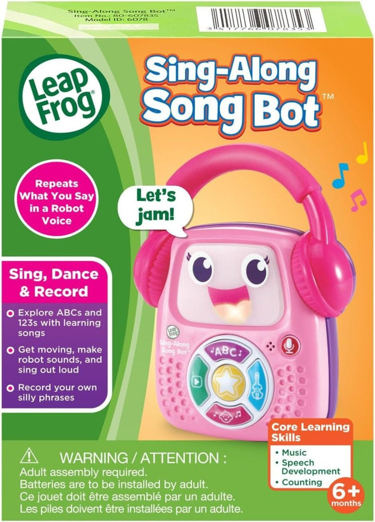 You're number one on this little bot's playlist! Grab the robot pal's headphone-shaped handle and boogie down to popular kids' tunes like "The Wheels on the Bus" and classical melodies. Sing along to learning jams that introduce numbers, letters and days of the week or get moving to the "Dance and Wiggle" song. It's showtime! Pressing the microphone button records the voice of your mini superstar and plays it back in four different robot voices. Let's dance with music on the go.