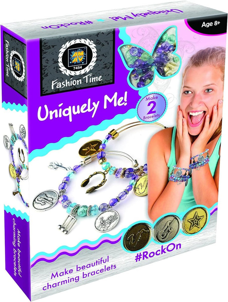 Design and create your own bracelets with AMAV's Uniquely Me charm bracelet kit. Choose from many different charms and beads to create your own friendship bracelet. The perfect gift for the holidays, birthdays or any other special occasion. The box includes an assortment of over 60 beads, 8 Rock and music themed charms and 2 Bracelets.